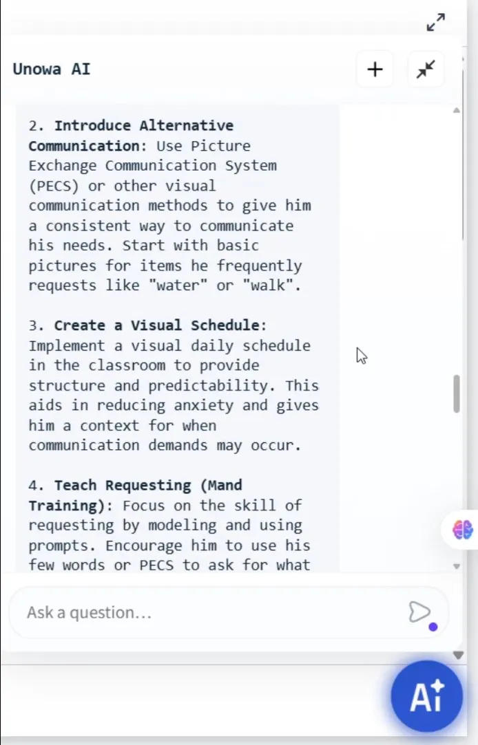 The specialist sees the full picture — both the skills that need to be developed and the strategies required to address challenging behaviors. And MIKKO AI Agent supports the implementation of this program step by step, offering the necessary materials, techniques, and guidance on what to do next.
